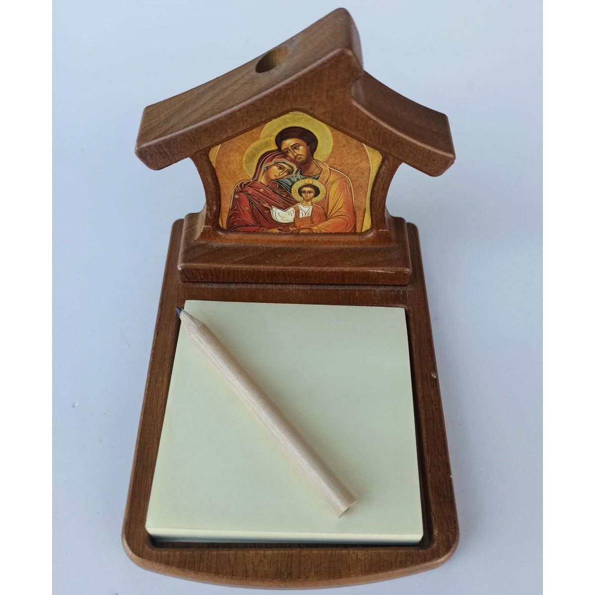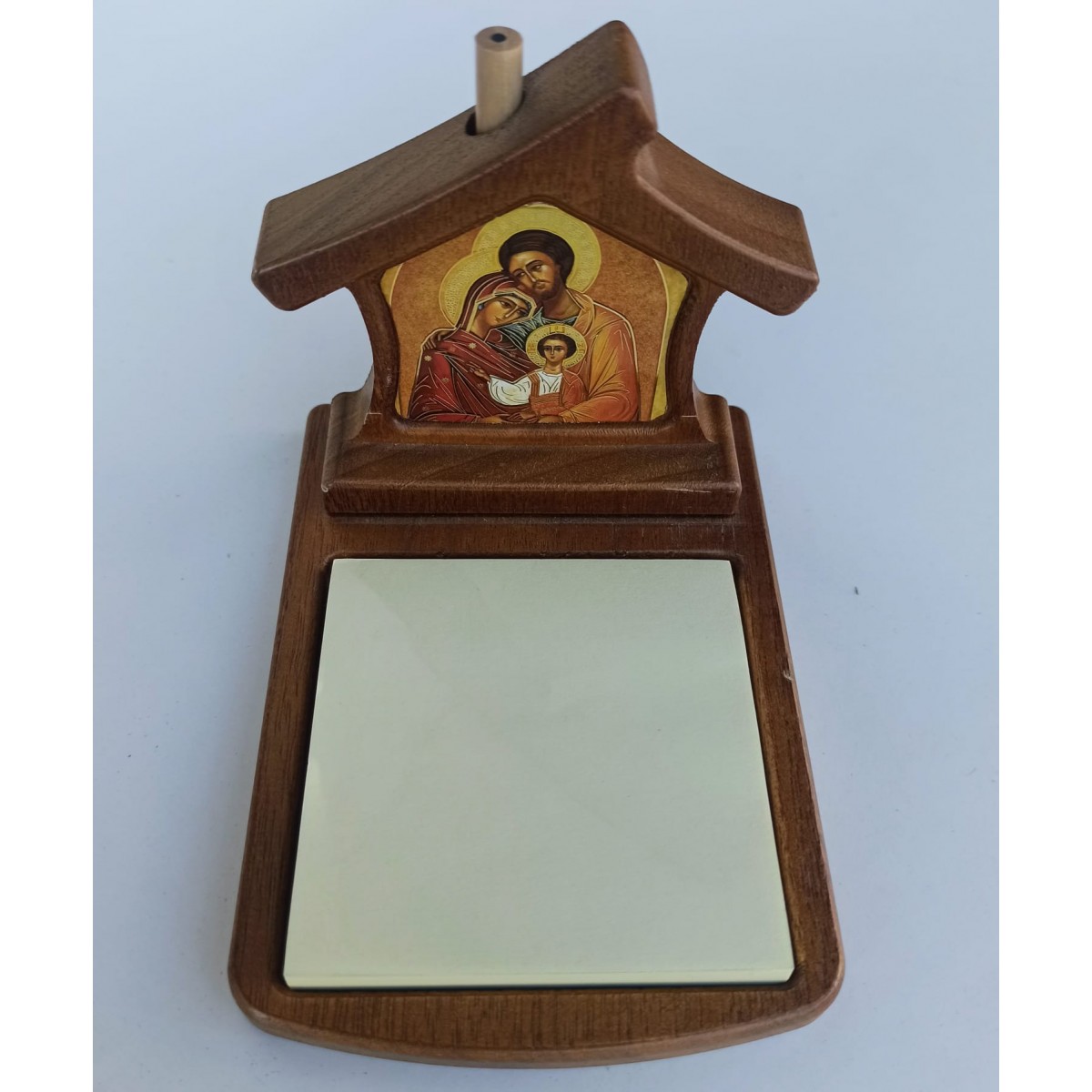 Bellissimo oggetto da regalo, a forma di casetta con disegnata una luminosa sacra famiglia.
