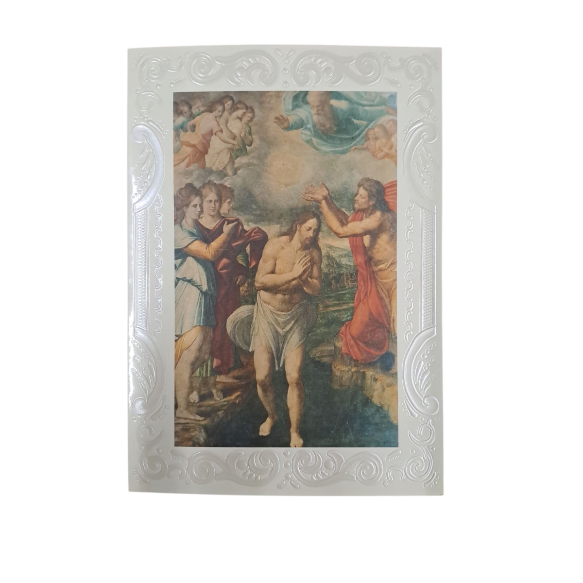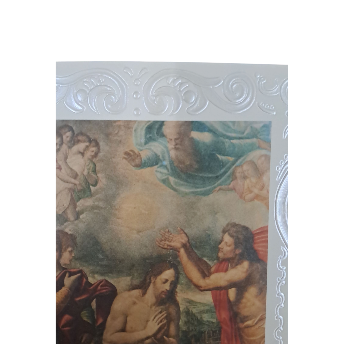 Immagine stampata del battesimo di Gesù con cornice in rilievo color avorio