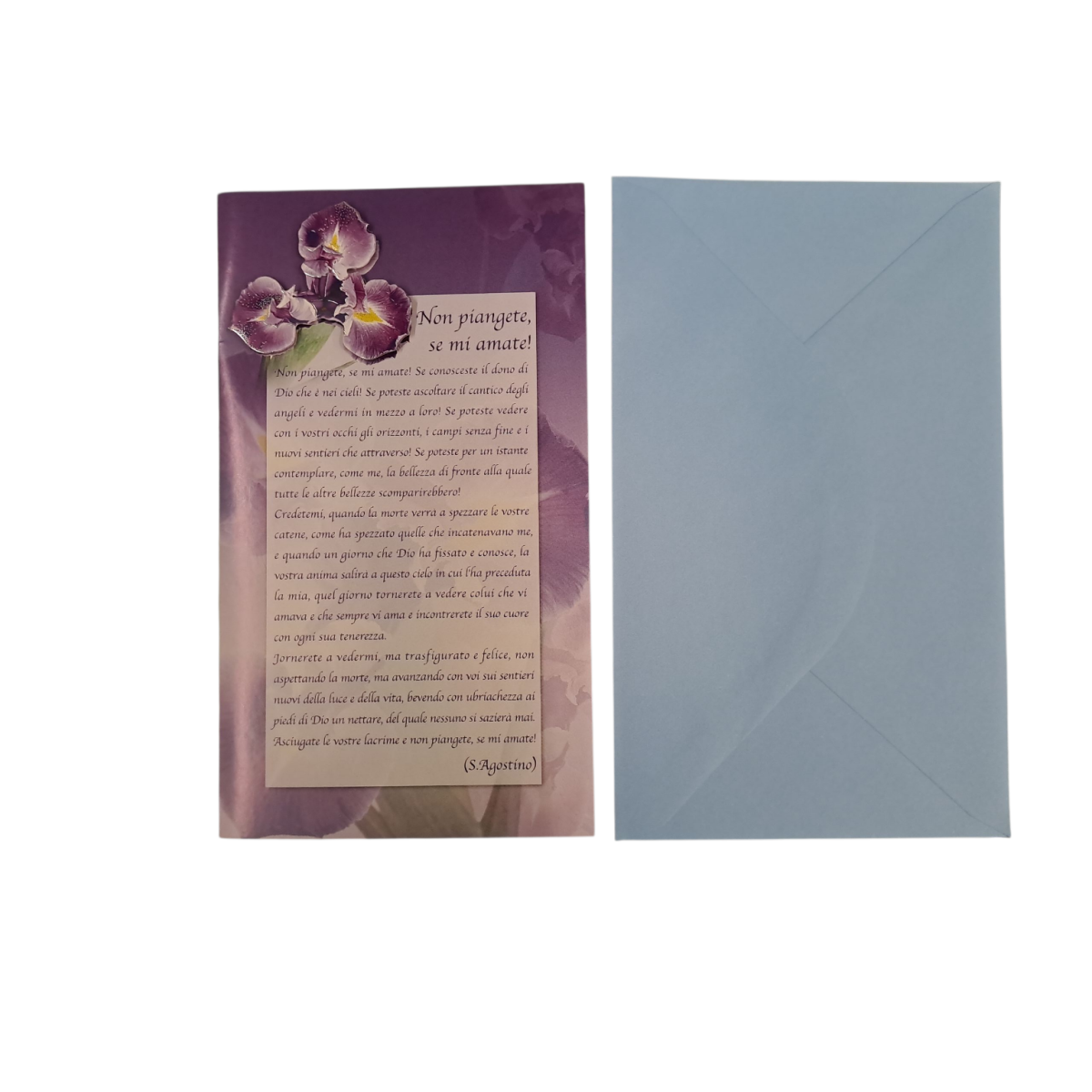 Biglietto con la famosa frase di Sant'Agostino "Non piangete, se mi amate!" il fiore è in rilievo