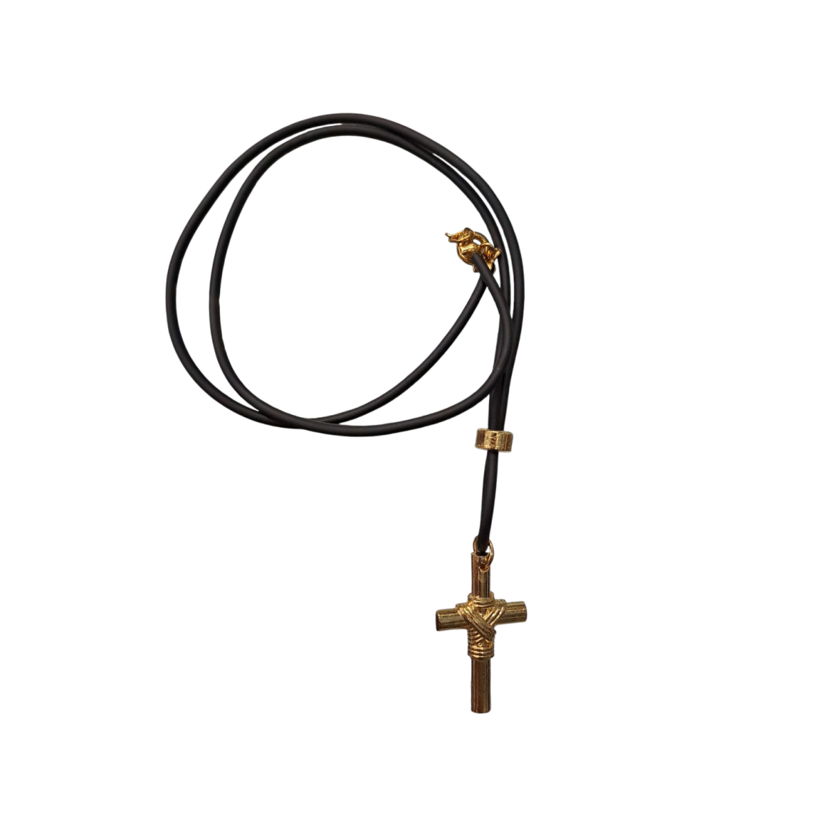 Croce in metallo dorato con cordoncino in caucciù nero.