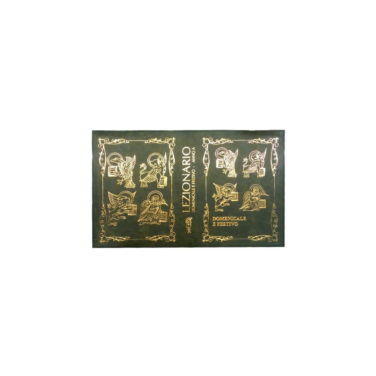 Copertina in pelle rigenerata, colore verde, per lezionari con fregi in oro.