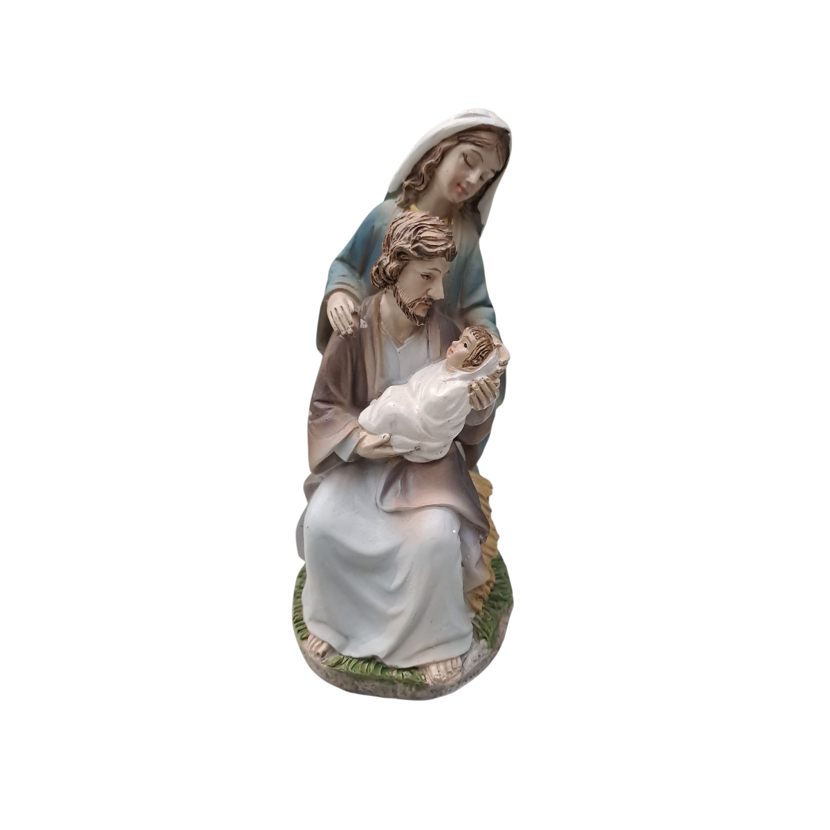 Statua raffigurante Giuseppe seduto sulla paglia mentre tiene tra le braccia il Bambino Gesù appena nato, con Maria in piedi alle sue spalle che abbraccia teneramente entrambi.