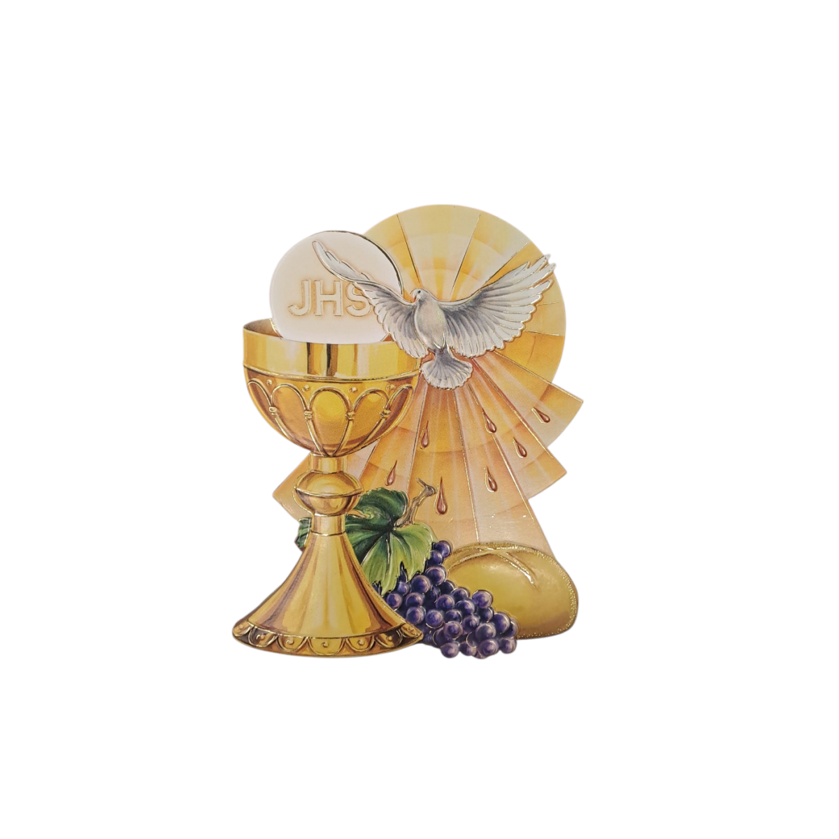 Quadretto da appoggio e da appendere con simbolo del Calice, pane e vino per il sacramento della Comunione e la Colomba per il sacramento della Confermazione