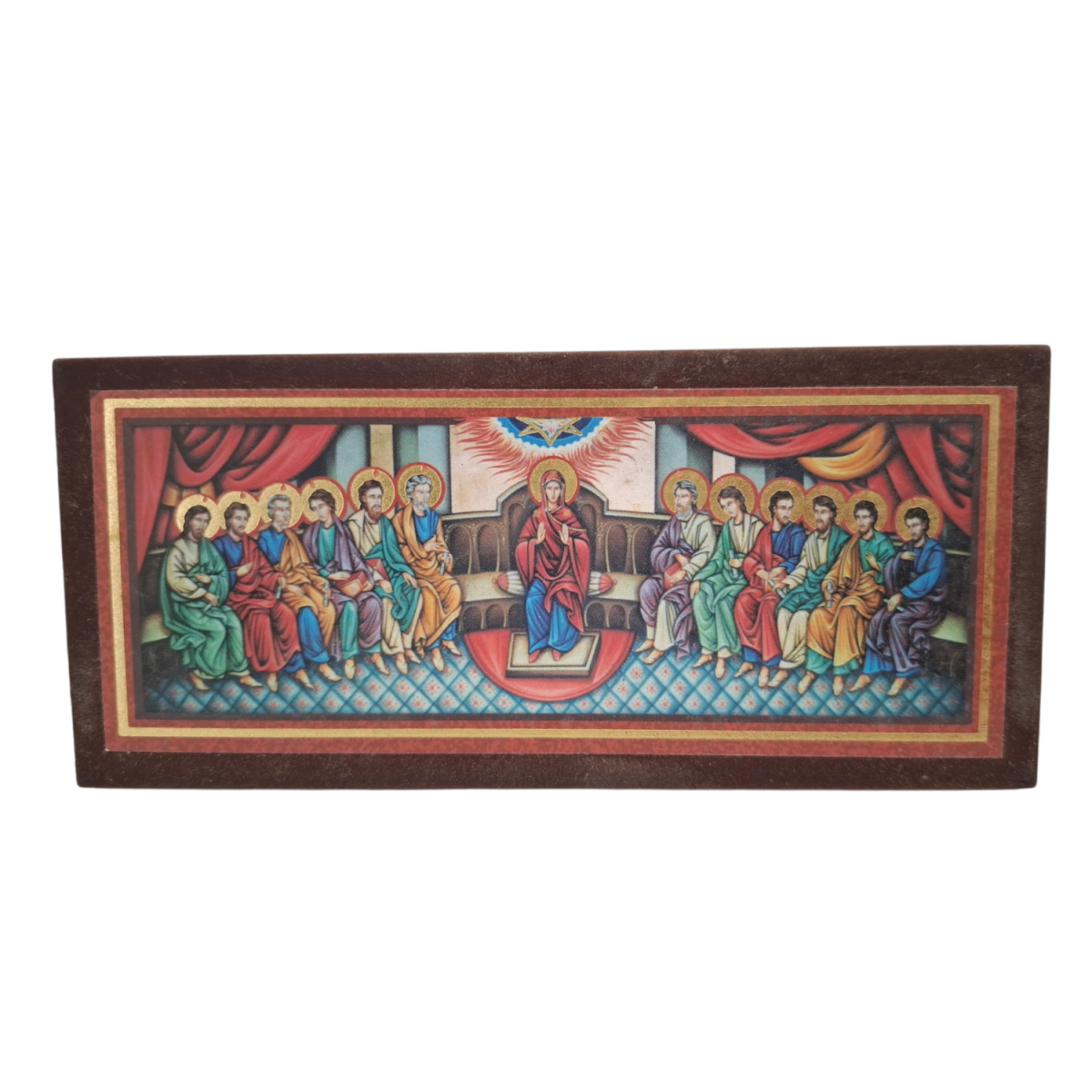 Iconetta bordo legno marrone raffigurata la pentecoste.
