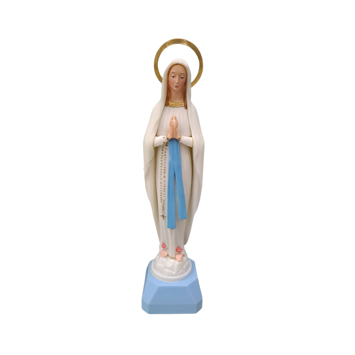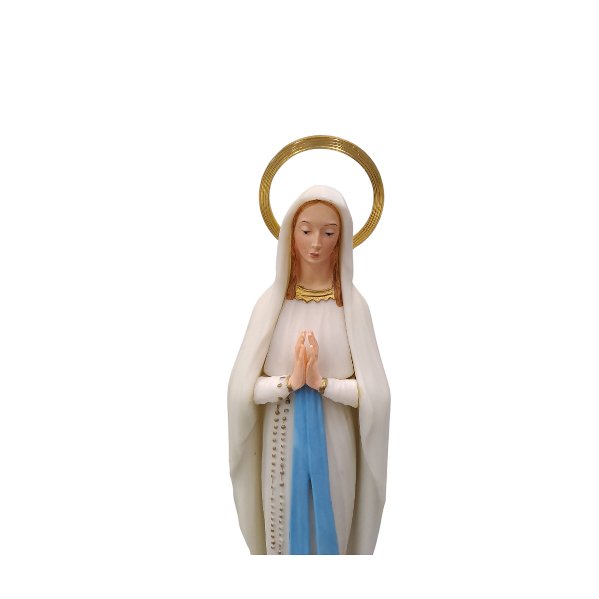 La Vergine Maria con le mani giunte in preghiera e un rosario che le prende il braccio indossa una veste e un velo bianco, una fascia azzurra alla vita.